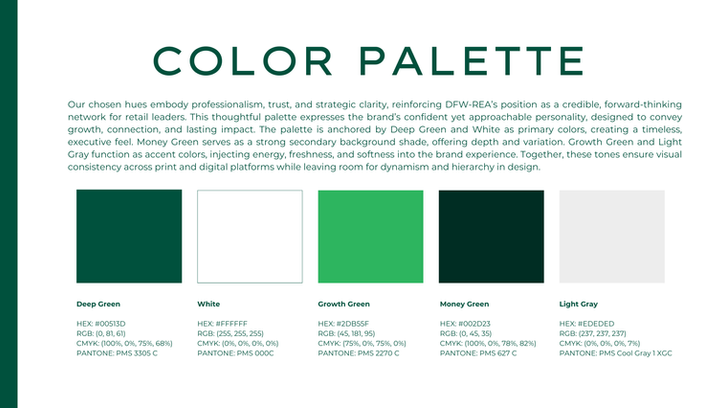 The updated identity introduces a refined logo system, a disciplined color palette, and clear typography to create uniformity across digital, event, and promotional touchpoints. This cohesive approach helps DFW-REA show up with confidence, strengthen audience recognition, and better engage the next generation of retail leaders while remaining rooted in executive-level relevance.
